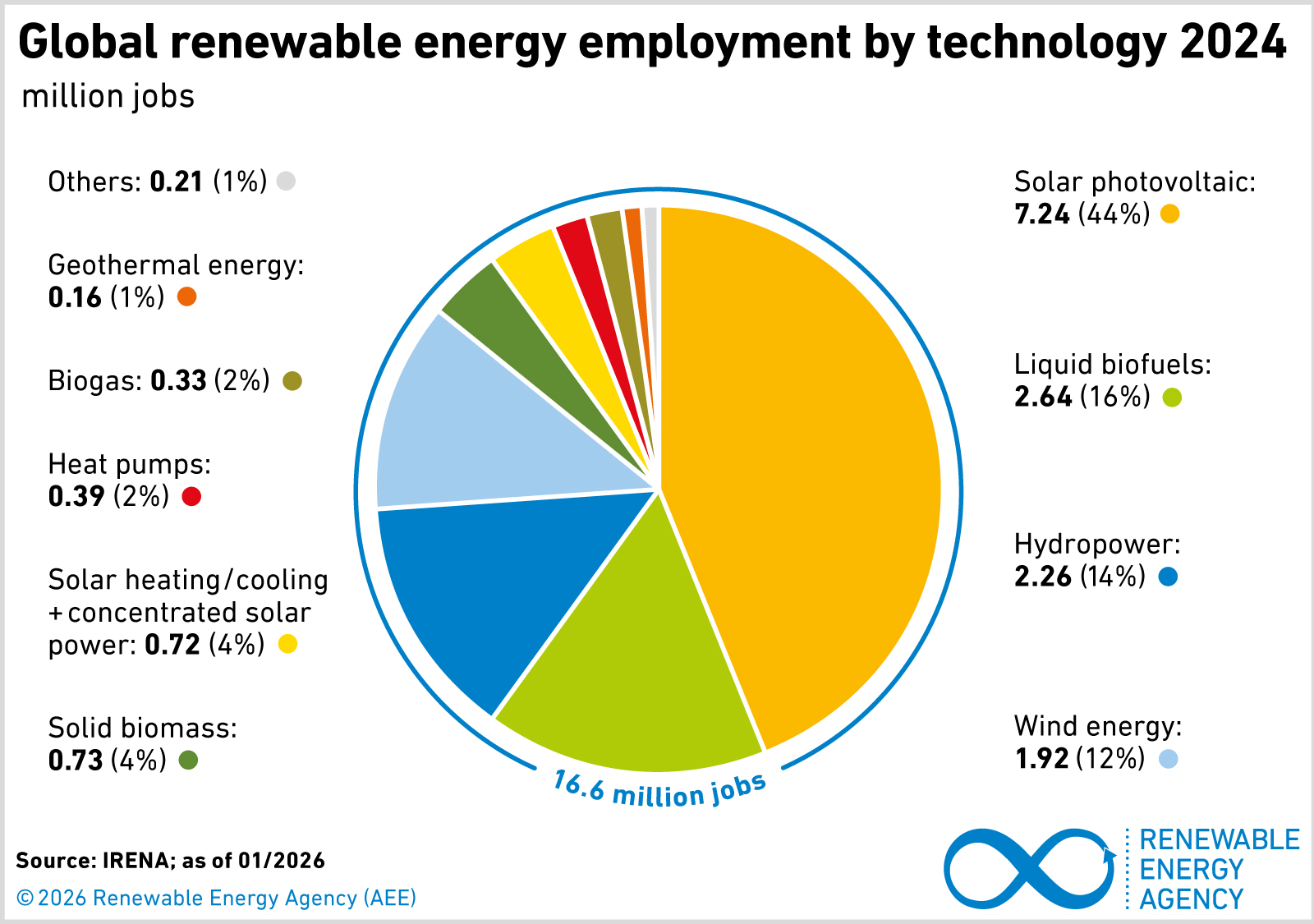 In 2024 renewable energy employed more than 16.6 million people around the globe. Since 2012, employment has grown from 7.3 million. Some figures only refer to direct employment, e.g. hydropower. Direct employment refers to jobs generated by core activities in renewable energy deployment. Indirect employment includes employment in the upstream industries that supply and support the core activities. This means intermediate inputs along the value chain of each renewable energy, e.g. the production of steel or other materials, financial and other services.