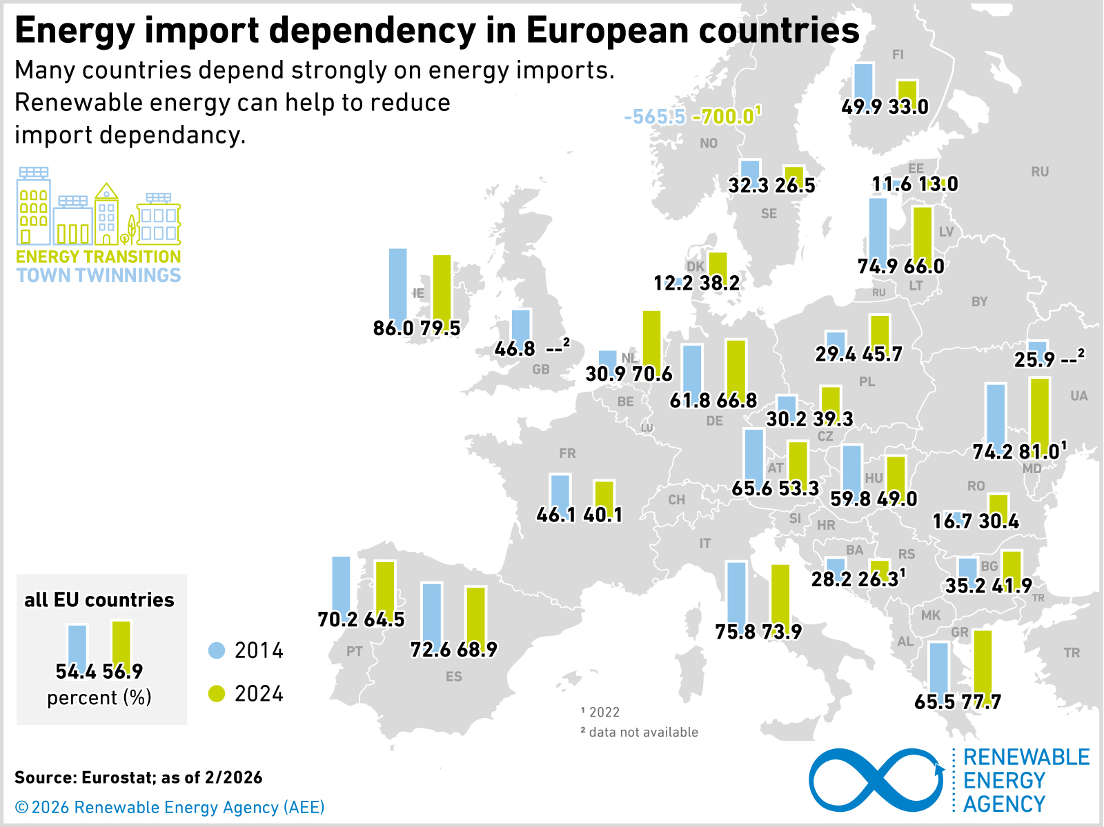 In the EU the relationship between the amount of energy imports and the total available amount of energy has risen since 2010. The dependance on energy imports is especially high e.g. in Luxemburg and Ireland with an import indicator of more than 90 %. Among EU-countries Sweden is the one with the lowest indicator for energy import dependancy. It can be assumed that Sweden and France have low energy import indicators because especially in France nuclear energy is treated as domestic energy despite the fact that it needs uranium imports. The import dependancy of Germany is about in the middle. Norway is the only country today with net energy export due to its large fossil gas and oil resources. Countries like Bosnia and Herzegovina or Moldova show very different energy import dependancy indicators. In order to get more independant from energy imports and to increase political independence it is important to expand the use of domestic renewable energy as well as to decrease energy consumption in total.