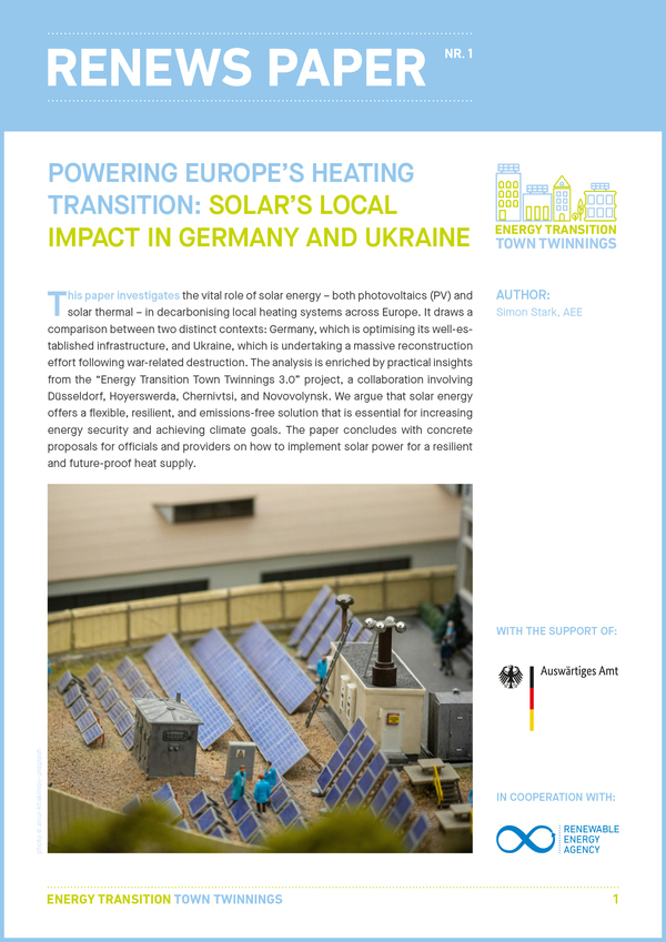 This paper investigates the vital role of solar energy – both photovoltaics (PV) and solar thermal – in decarbonising local heating systems across Europe. It draws a comparison between two distinct contexts: Germany, which is optimising its well-established infrastructure, and Ukraine, which is undertaking a massive reconstruction effort following war-related destruction. The analysis is enriched by practical insights from the “Energy Transition Town Twinnings 3.0” project, a collaboration involving Düsseldorf, Hoyerswerda, Chernivtsi, and Novovolynsk. We argue that solar energy offers a flexible, resilient, and emissions-free solution that is essential for increasing energy security and achieving climate goals. The paper concludes with concrete proposals for officials and providers on how to implement solar power for a resilient and future-proof heat supply.