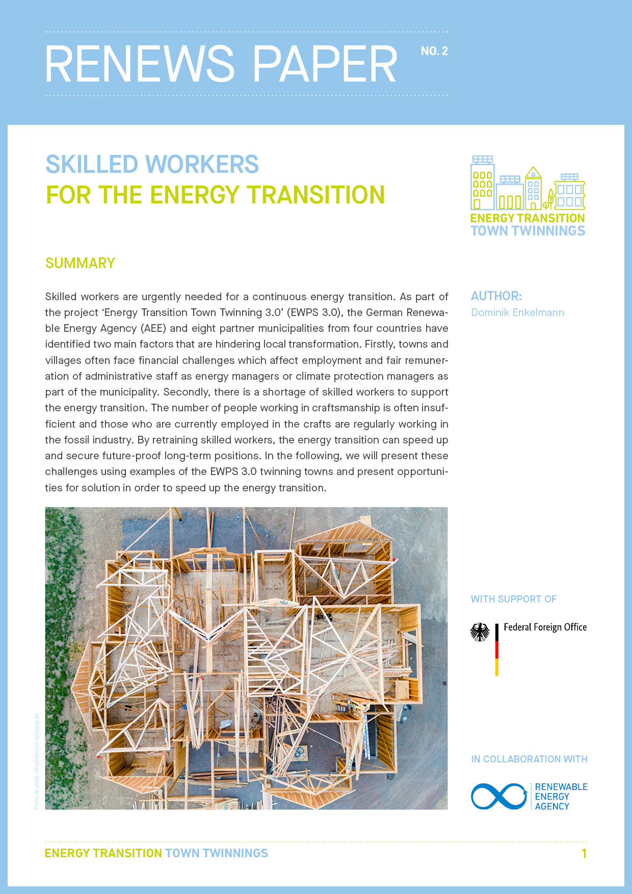 Skilled workers are urgently needed for a continuous energy transition. As part of the project ‘Energy Transition Town Twinning 3.0’ (EWPS 3.0), the German Renewa-ble Energy Agency (AEE) and eight partner municipalities from four countries have identified two main factors that are hindering local transformation. Firstly, towns and villages often face financial challenges which affect employment and fair remuner-ation of administrative staff as energy managers or climate protection managers as part of the municipality. Secondly, there is a shortage of skilled workers to support the energy transition. The number of people working in craftsmanship is often insuf-ficient and those who are currently employed in the crafts are regularly working in the fossil industry. By retraining skilled workers, the energy transition can speed up and secure future-proof long-term positions. In the following, we will present these challenges using examples of the EWPS 3.0 twinning towns and present opportuni-ties for solution in order to speed up the energy transition.