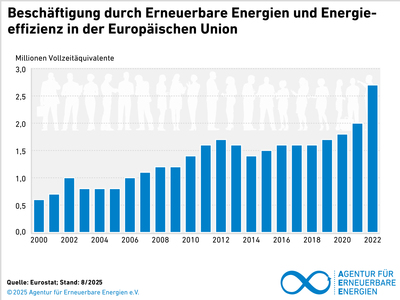 Die Sektoren Erneuerbare Energien und Energieeffizienz treiben nicht nur die Unabhängigkeit von fossilen Rohstoffen voran, sondern sind auch ein bedeutender Jobmotor in der Europäischen Union. Im Jahr 2022 erreichte die Beschäftigung einen neuen Höchststand von über 2,5 Millionen Vollzeitäquivalenten in der EU – so viele wie nie zuvor. Dies bedeutet ein massives Wachstum im Vergleich zum Jahr 2000, als die Zahl der Beschäftigten bei knapp über 500.000 lag. Über mehr als zwei Jahrzehnte hinweg zeigt sich damit ein klarer und kontinuierlicher Aufwärtstrend in der Arbeitsplatzschaffung. Diese Entwicklung stärkt die regionale Wertschöpfung, fördert die europäische Wirtschaft und erhöht die energiepolitische Souveränität.