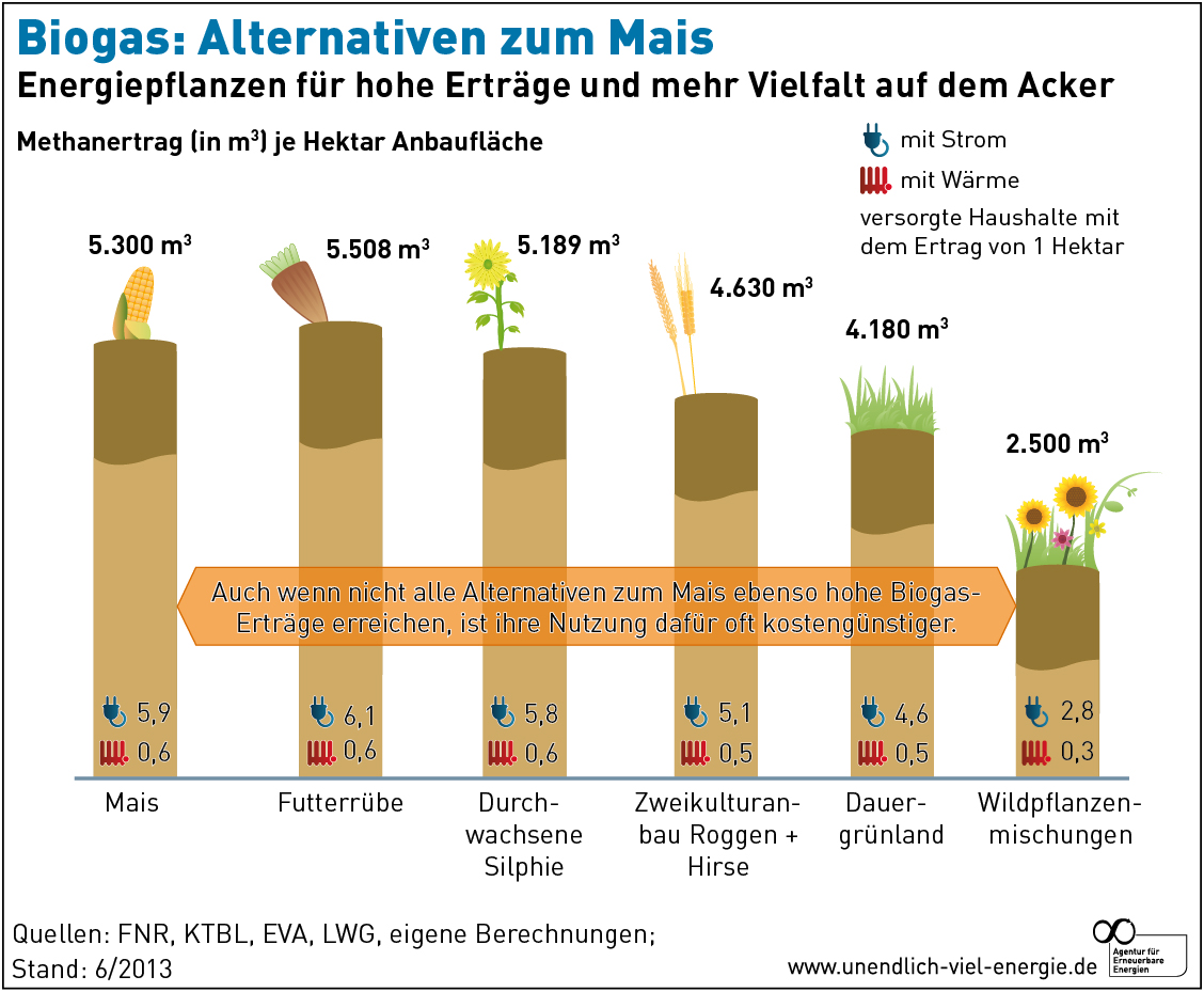 Die Biogasanlage muss nicht immer mit Mais gefüttert werden. Innovative Anbaukonzepte wie z. B. Zweikulturensysteme (zwei Energiepflanzen wachsen gleichzeitig auf einem Acker), können neben einem extensiven Anbau von mehrjährigen Wildpflanzen somit die Artenvielfalt steigern. Bunte Wildpflanzenmischungen sind nicht nur eine Bereicherung des Landschaftsbildes. Wie viele Energiepflanzen sparen sie auch Düngemittel und Pflanzenschutzmittel. Trotz geringerer Erträge je Hektar sind sie wegen der niedrigen Betriebskosten attraktive Alternativen zum Mais. Auch bisher kaum genutzte, in Vergessenheit geratene Pflanzen werden z.B. für die energetische Nutzung wieder attraktiv.
