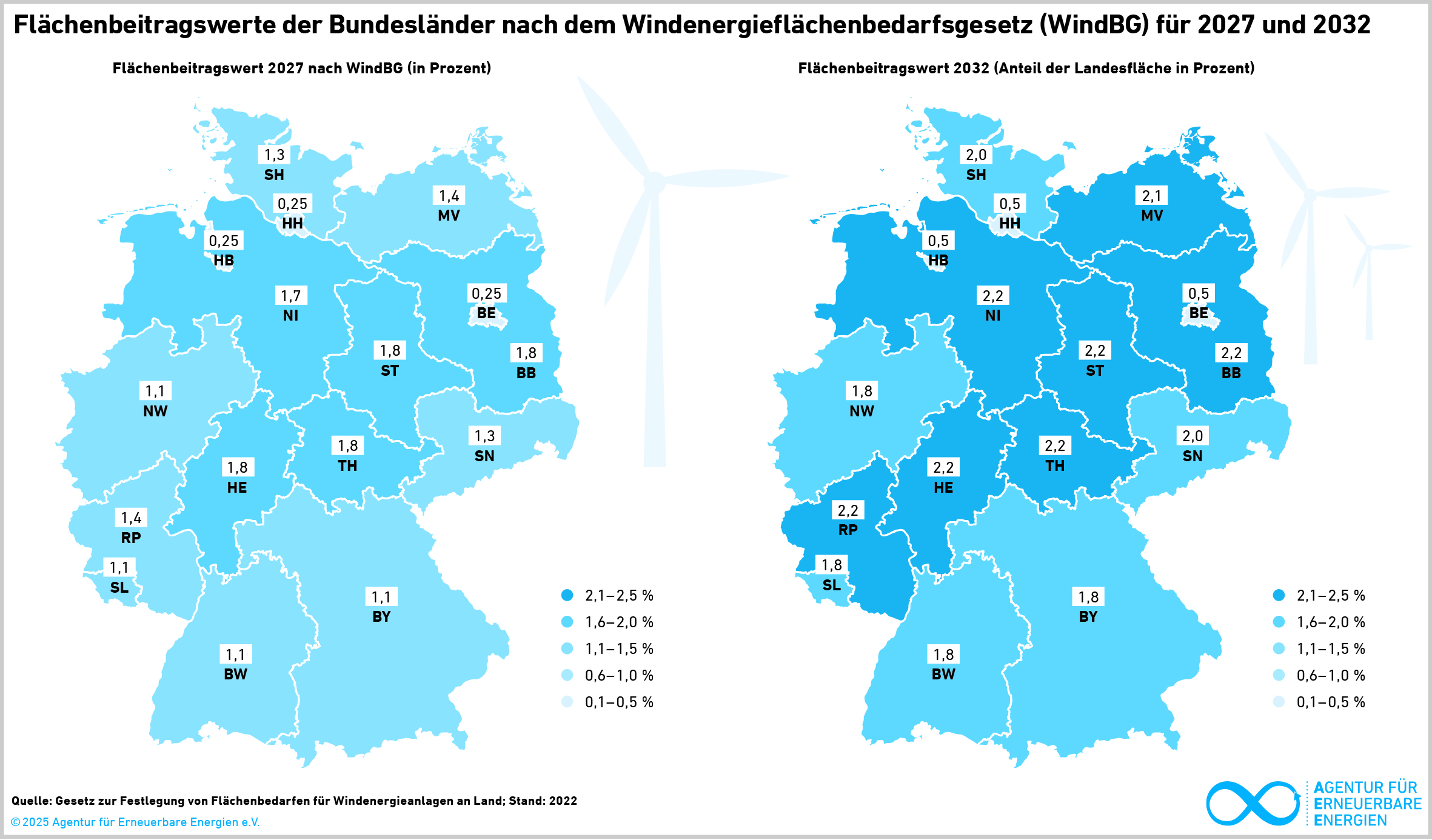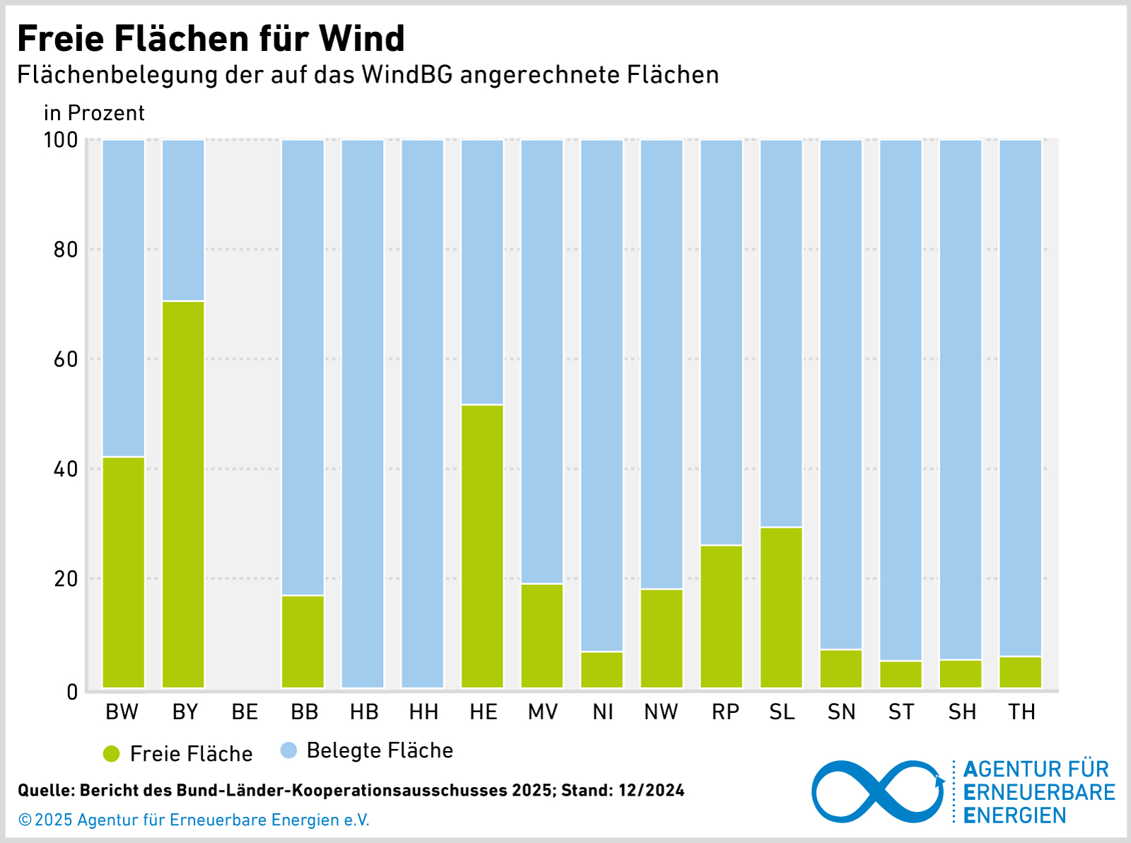 Für den Ausbau von Wind- und Solarenergie definiert das Erneuerbare-Energien-Gesetz verbindliche Ausbaupfade. Für die Windenergie an Land legt das Windenergieflächenbedarfsgesetz (WindBG) zusätzlich verpflichtende Flächenziele fest. Der Bund-Länder-Kooperationsausschuss bewertet jährlich, wie weit die Bundesländer bei der Ausweisung geeigneter Flächen sowie beim realen Ausbau vorangekommen sind. Nach Auswertung des Ausschusses waren zum 31. Dezember 2024 etwas mehr als ein Prozent der Fläche Deutschlands als Windenergiegebiet ausgewiesen. Hessen und Bremen haben ihre Zwischenziele für 2027 bereits Ende 2024 übertroffen.