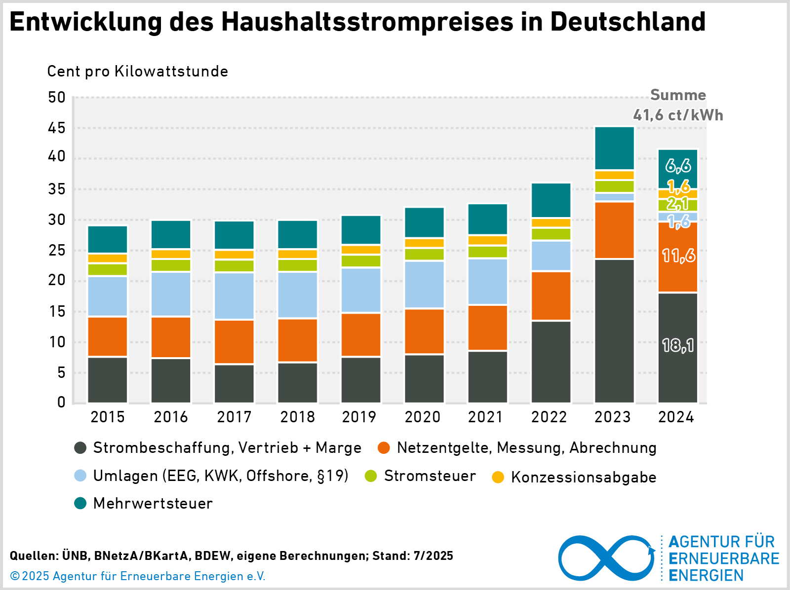 Je nach individuellem Stromverbrauch und gewähltem Tarif kann die Höhe im Einzelfall deutlich abweichen. Regionale Unterschiede gibt es durch unterschiedlich hohe Konzessionsabgaben der Kommunen für die Nutzung von Wegen und das Verlegen von Stromleitungen sowie durch unterschiedliche Netzentgelte zwischen ländlichen Gebieten und Großstädten sowie Regionen mit viel oder wenig Ausbau Erneuerbarer Energien und Investitionen in den Netzausbau. Ab 2021/2022 macht sich die durch den Krieg zwischen Russland und der Ukraine ausgelöste Energiepreiskrise bemerkbar, aber auch staatliche Eingriffe wie die Abschaffung der EEG-Umlage und die Strompreisbremse. Die Grafiken basieren auf Informationen der Übertragungsnetzbetreiber, der Bundesnetzagentur, des BDEW sowie weiteren Veröffentlichungen. Für Positionen wie Vertriebskosten oder Marge gibt es naturgemäß keine transparenten Daten. Immerhin trennen die Monitoringberichte der Bundesnetzagentur/Bundeskartellamt ab 2022 die Strombeschaffungskosten von dem gemeinsamen Posten Vertrieb und Marge.
