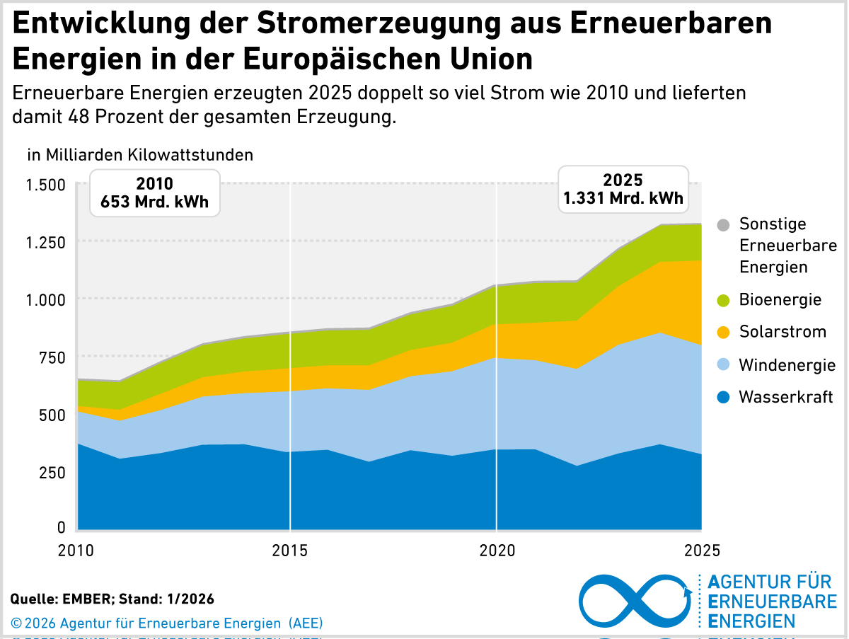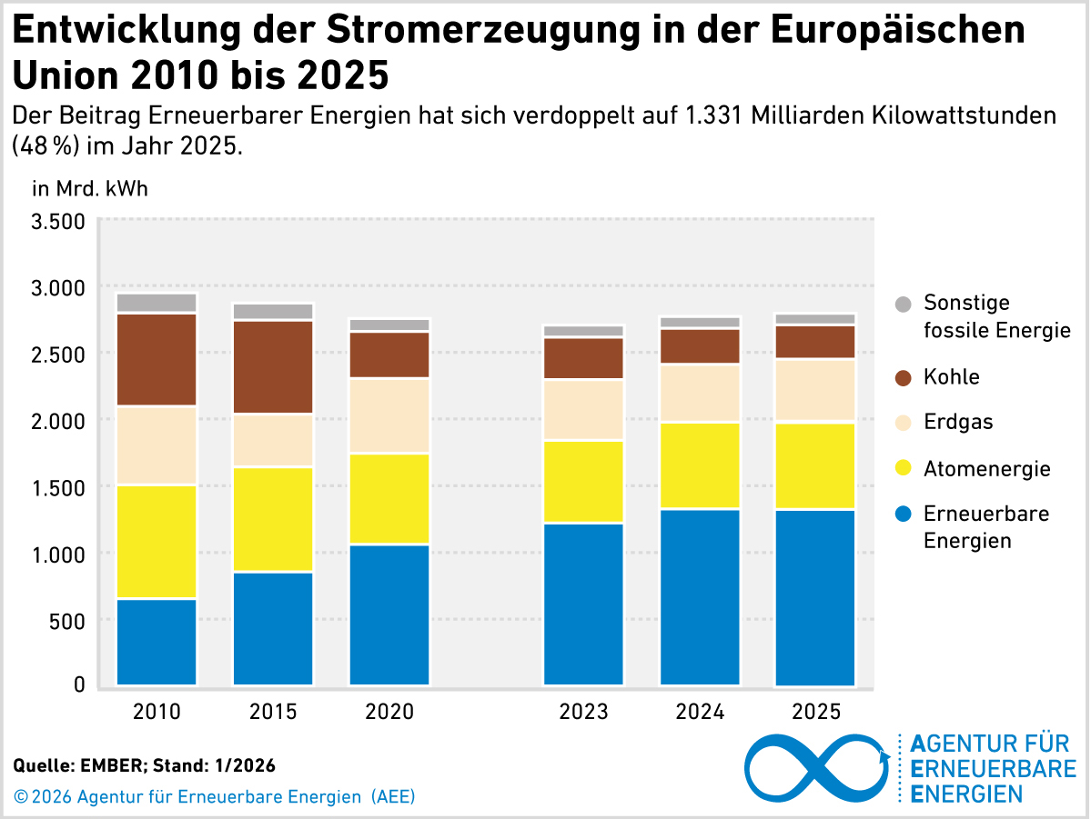 Im Jahr 2025 stammte fast die Hälfte der gesamten Stromerzeugung in der Europäischen Union aus Erneuerbaren Energien. Zum ersten Mal in der Geschichte lieferten Sonne und Wind mehr Strom als fossile Energieträger. Zwar sorgten ungünstige Windbedingungen für ein schlechtes Windenergiejahr, das konnte durch ein außergewöhnliches Wachstum der Solarenergie jedoch überkompensiert werden. Dank der Neuinstallation von Photovoltaikanlagen und einer hohen Solareinstrahlung wuchs die Solarstromerzeugung im Jahr 2025 um 20 Prozent im Vergleich zum Vorjahr. Innerhalb der fossilen Energien gab es eine Verschiebung von Kohle zu Gas.