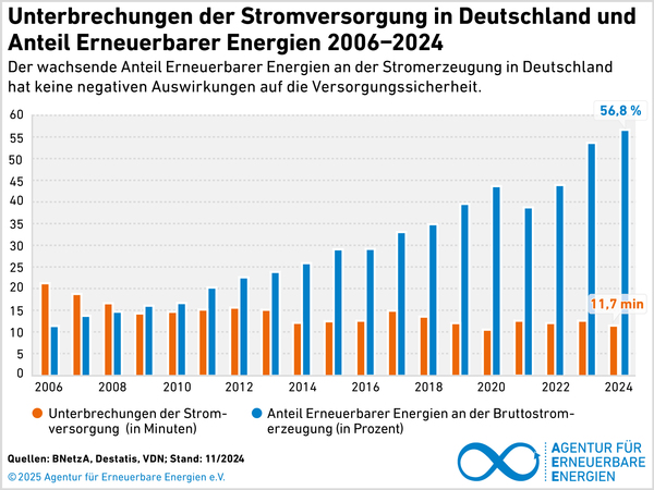 Die durchschnittliche Dauer von Unterbrechungen der Stromversorgung lag im Jahr 2024 laut Bundesnetzagentur bei 11,7 Minuten. Das ist weniger als im Vorjahr (12,8 min) und auch weniger als der Durchschnittswert der vergangenen zehn Jahre (12,7 min). Der wachsende Anteil Erneuerbarer Energien an der Stromerzeugung in Deutschland hat bisher keine negativen Auswirkungen auf die Versorgungssicherheit. Grundlage ist der SAIDI (System Average Interruption Duration Index) nach dem Energiewirtschaftsgesetz, der durch die Bundesnetzagentur und das Forum Netztechnik/Netzbetrieb im VDE veröffentlicht wird. Er gibt die durchschnittliche Versorgungsunterbrechung je angeschlossenen Letztverbraucher innerhalb eines Kalenderjahres an.