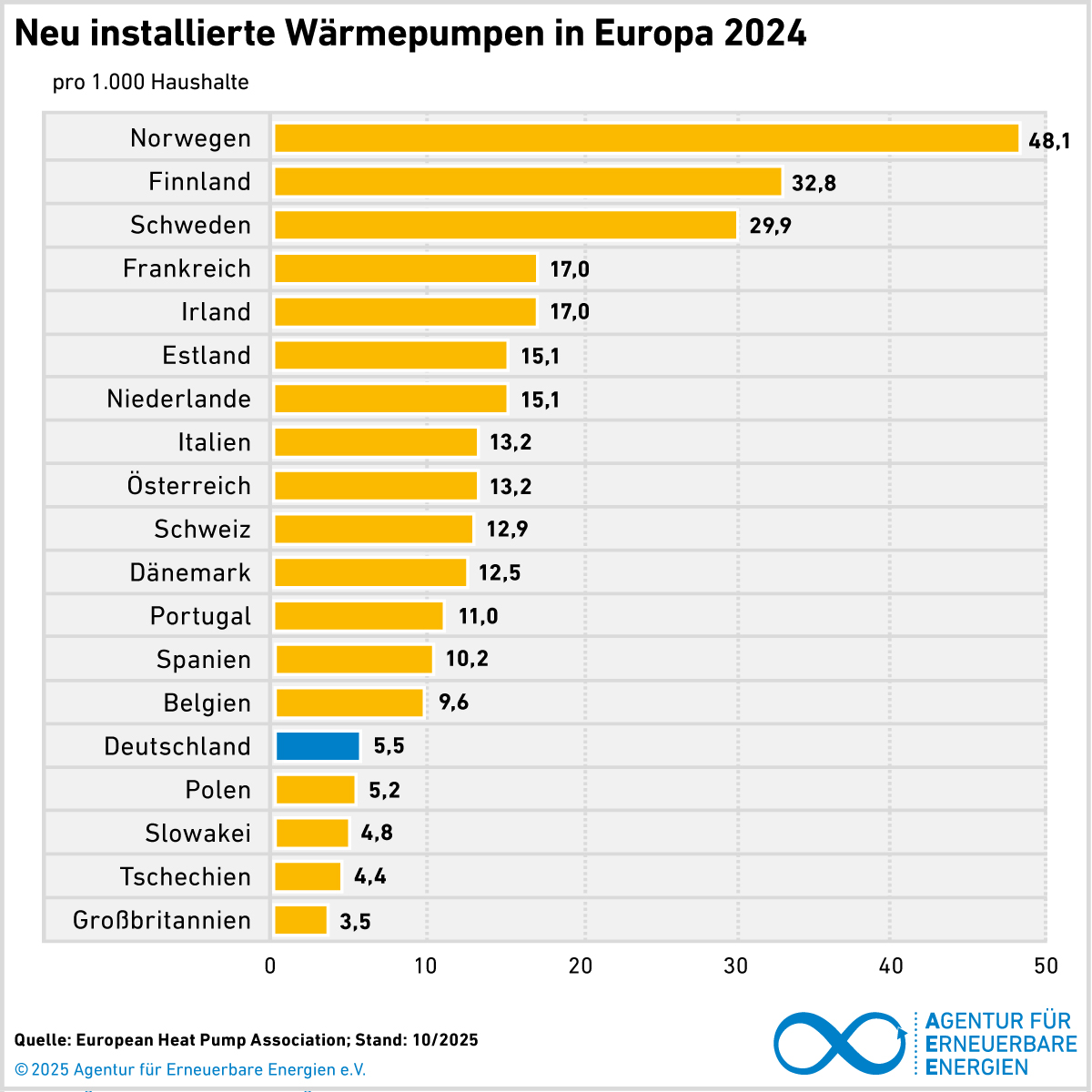 Im Ländervergleich sind die Unterschiede bei der Marktdurchdringung mit Wärmepumpen in Europa enorm. Nach Angaben der European Heat Pump Association (EHPA) sind die meisten Wärmepumpen pro tausend Haushalte in Norwegen installiert. Dort kamen Anfang 2025 auf 1.000 Haushalte rund 632 installierte Wärmepumpen. Danach folgt Finnland mit insgesamt 524 Wärmepumpen pro 1.000 Haushalte. Auch bei den im Jahr 2024 neu installierten Wärmepumpen führen Norwegen und Finnland die Absatzliste an. Deutschland liegt sowohl beim Absatz neuer Wärmepumpen als auch beim Gesamtbestand pro 1.000 Haushalten hinter den meisten europäischen Nachbarländern. Weniger Wärmepumpen wurden nur noch in Polen, Slowakei, Großbritannien und Ungarn eingebaut. Es gibt also noch ein großes Potenzial für einen stärkeren Rollout. Anders stellt sich die Rangliste in Bezug auf die installierte Gesamtleistung dar. Dadurch, dass Deutschland, Frankreich und Italien die bevölkerungsreichsten Länder sind, ist hier die installierte Gesamtleistung besonders hoch, auch wenn die Marktdurchdringung pro tausend Haushalte geringer ist.