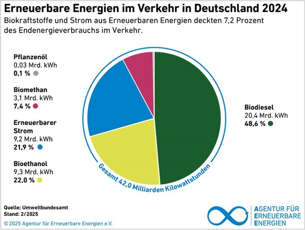 Mit mehr als drei Vierteln der Erneuerbaren Energien im Verkehr leisten Biokraftstoffe den größten Beitrag zum Klimaschutz in dem Sektor. Von 2015 bis 2023 haben sie in Deutschland mehr als 100 Millionen Tonnen CO2 vermieden. Der Hauptanteil entfällt dabei auf Biodiesel, der heute vorrangig als siebenprozentige Beimischung zu fossilem Diesel (B7) im gesamten Markt eingesetzt wird. B10 mit zehn Prozent Biodieselanteil soll zukünftig zum Standard werden. Höhere Beimischungen können in Nutzfahrzeugen eingesetzt werden, die für B20, B30 oder reinen Biodiesel (B100) freigegeben sind. Je nach Rohstoff reduziert Biodiesel klimaschädliche CO2-Emissionen um 70 bis 90 Prozent. Weitere Biokraftstoffe wie Bioethanol und Biomethan sowie hydrierte Pflanzenöle (HVO) sind am Markt erhältlich und werden in verschiedenen Anwendungbereichen eingesetzt.