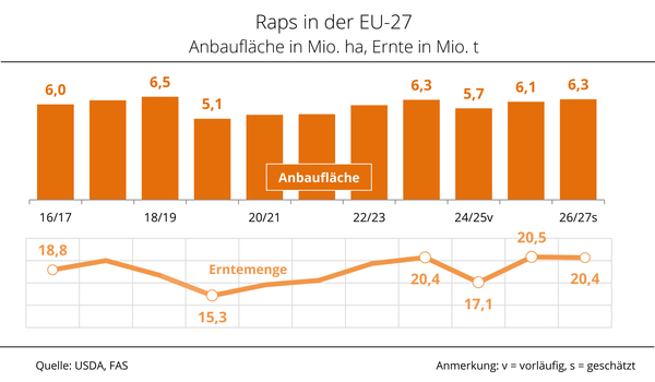 In seiner jüngst veröffentlichten ersten Schätzung hat der Auslandsdienst des US-Landwirtschaftsministeriums mit Sitz in Wien (FAS) die EU-Anbaufläche für Raps zur Ernte 2026 auf voraussichtlich 6,3 Mio. ha geschätzt. Dies ist eine Ausweitung um rund 2,7 % im Vergleich zum Vorjahr. Neben einem zur Aussaat attraktiven Kontraktpreis ist als Grund für diese Entwicklung die agronomische Bedeutung der Blattfrucht Raps als wichtiges, der Biodiversität dienendes Element in getreidereichen Fruchtfolgen anzuführen. Aktuell prägen in Deutschland blühende Rapsfelder regional das Landschaftsbild. Darin zeigt sich die Bedeutung dieser Kulturpflanze besonders eindrucksvoll. Die gelben Flächen sind nicht nur ein prägendes Landschaftsbild, sondern Ausdruck einer vielseitigen Nutzung, die Ernährung, Energie und Landwirtschaft miteinander verbindet. Bei erwarteten durchschnittlichen Erträgen rechnet der FAS 2026 mit einer EU-Ernte von 20,4 Mio. t, die damit knapp unter dem Vorjahresniveau von 20,5 Mio. t bleiben würde.