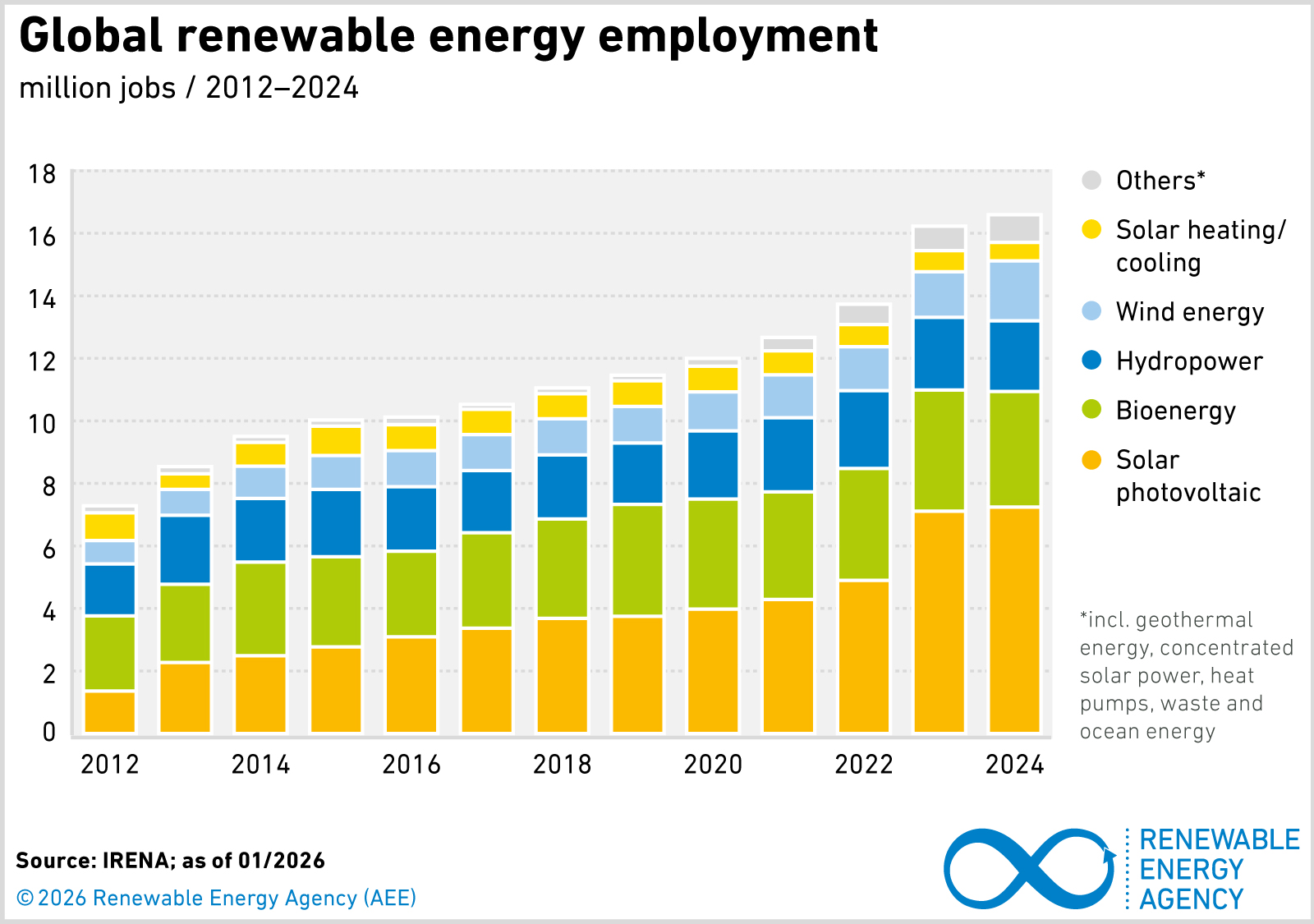 In 2024 renewable energy employed more than 16.6 million people around the globe. Since 2012, employment has grown from 7.3 million. Some figures only refer to direct employment, e.g. hydropower. Direct employment refers to jobs generated by core activities in renewable energy deployment. Indirect employment includes employment in the upstream industries that supply and support the core activities. This means intermediate inputs along the value chain of each renewable energy, e.g. the production of steel or other materials, financial and other services.