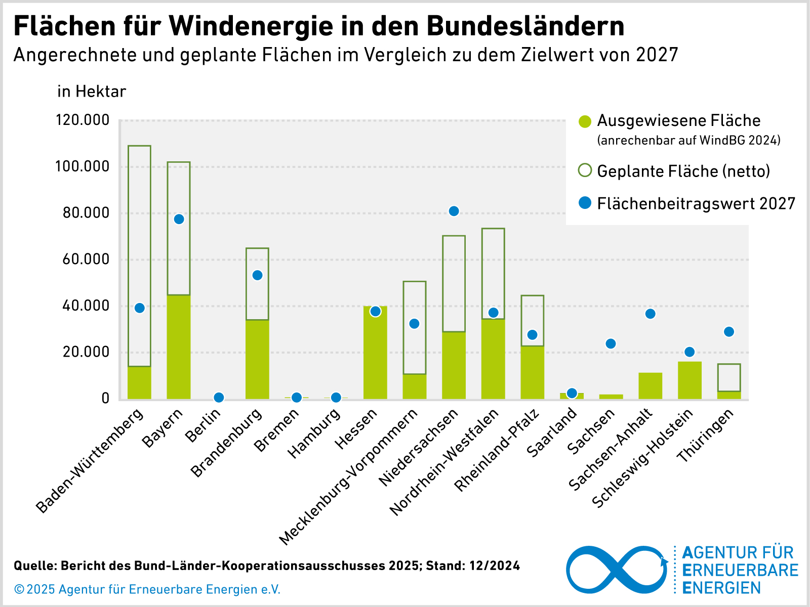 Für den Ausbau von Wind- und Solarenergie definiert das Erneuerbare-Energien-Gesetz verbindliche Ausbaupfade. Für die Windenergie an Land legt das Windenergieflächenbedarfsgesetz (WindBG) zusätzlich verpflichtende Flächenziele fest. Der Bund-Länder-Kooperationsausschuss bewertet jährlich, wie weit die Bundesländer bei der Ausweisung geeigneter Flächen sowie beim realen Ausbau vorangekommen sind. Nach Auswertung des Ausschusses waren zum 31. Dezember 2024 etwas mehr als ein Prozent der Fläche Deutschlands als Windenergiegebiet ausgewiesen. Hessen und Bremen haben ihre Zwischenziele für 2027 bereits Ende 2024 übertroffen.