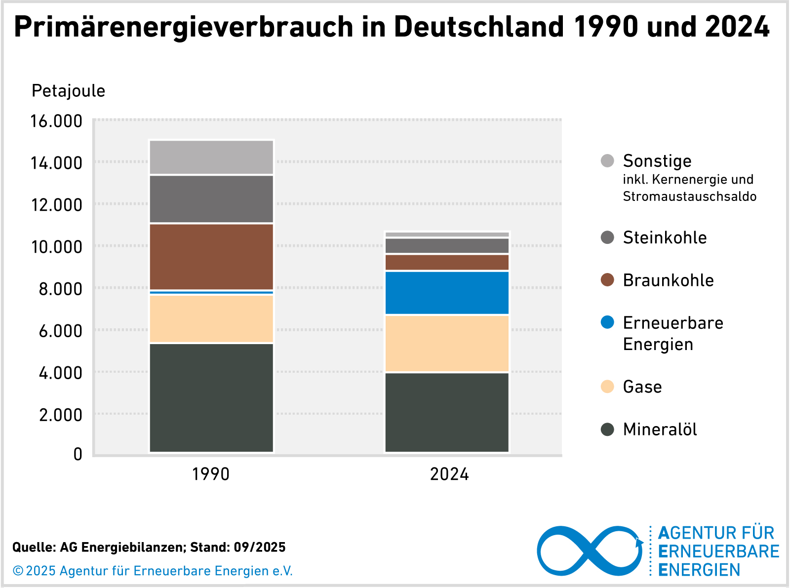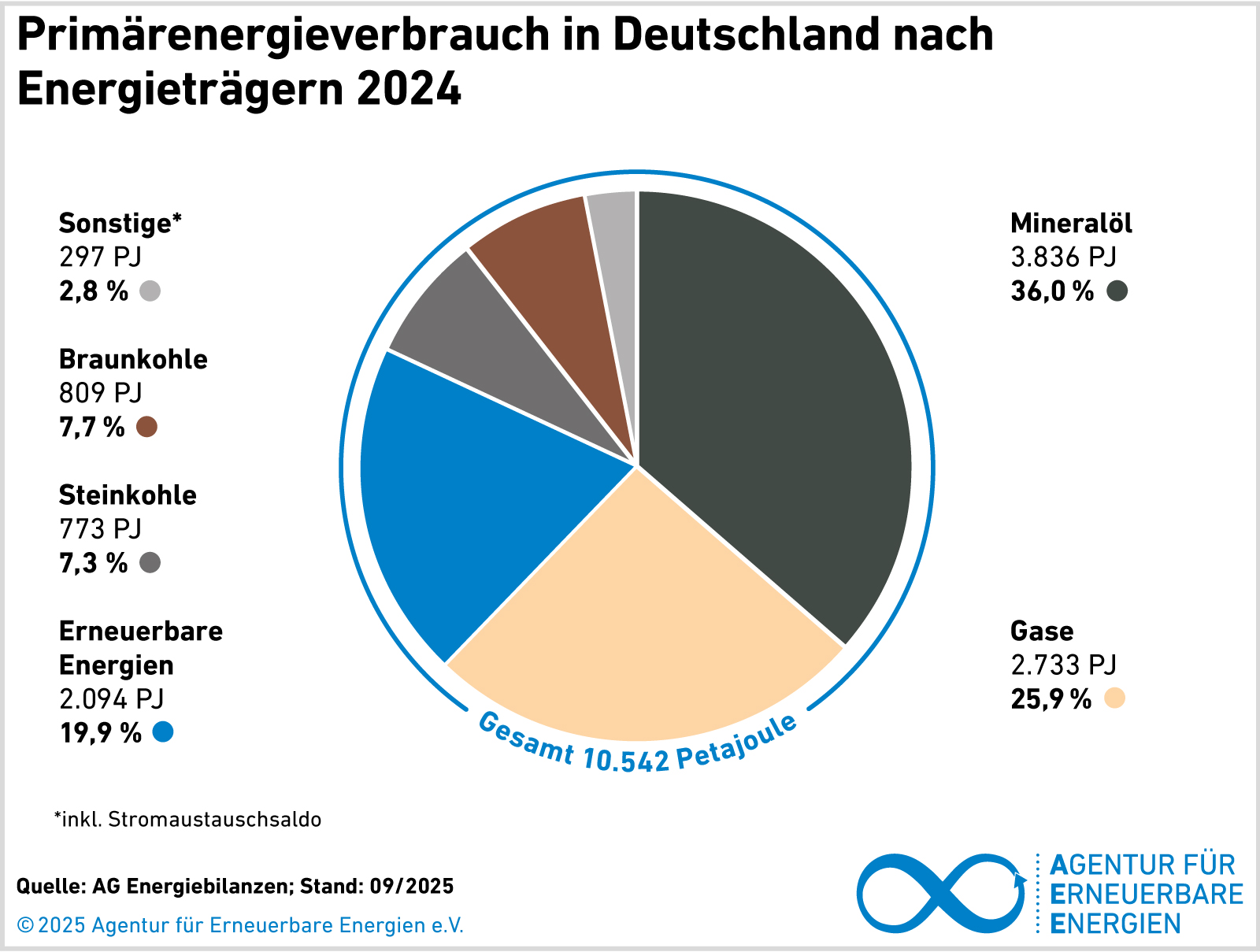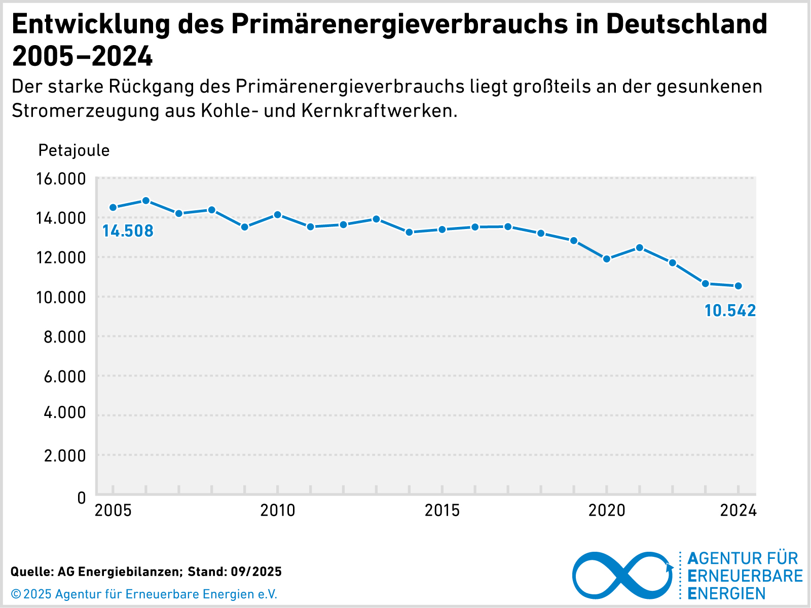 Der Primärenergieverbrauch in Deutschland betrug im Jahr 2024 insgesamt 10.542 Petajoule oder 2.928 Milliarden Kilowattstunden. Er ist damit gegenüber dem Vorjahr noch einmal leicht gesunken. Die Gründe dafür liegen neben dem erfreulichen Ausbau der Erneuerbaren Energien vor allem in der weiterhin schwachen Wirtschaftsleistung, der warmen Witterung und einem Rückgang der Stromerzeugung aus Braun- und Steinkohle. Verbrauchssteigernde Faktoren sind hingegen die zunehmende Bevölkerungszahl und gesunkene Energie-, vor allem Erdgaspreise. Der Anteil der Erneuerbaren Energien lag im Jahr 2024 bei knapp 20 Prozent. In der langfristigen Entwicklung lässt sich der mehr oder weniger stetige Rückgang des Primärenergieverbrauchs seit 1990 erkennen, der zum großen Teil auf dem Rückgang der Kohlenutzung und dem Ausstieg aus der Atomenergie beruht. Dem stehen das starke Wachstum der Erneuerbaren Energien und der zunehmende Einsatz von Erdgas gegenüber. Damit ist die Effizienz der Energieversorgung gestiegen, allerdings auch die Abhängigkeit von Erdgasimporten.