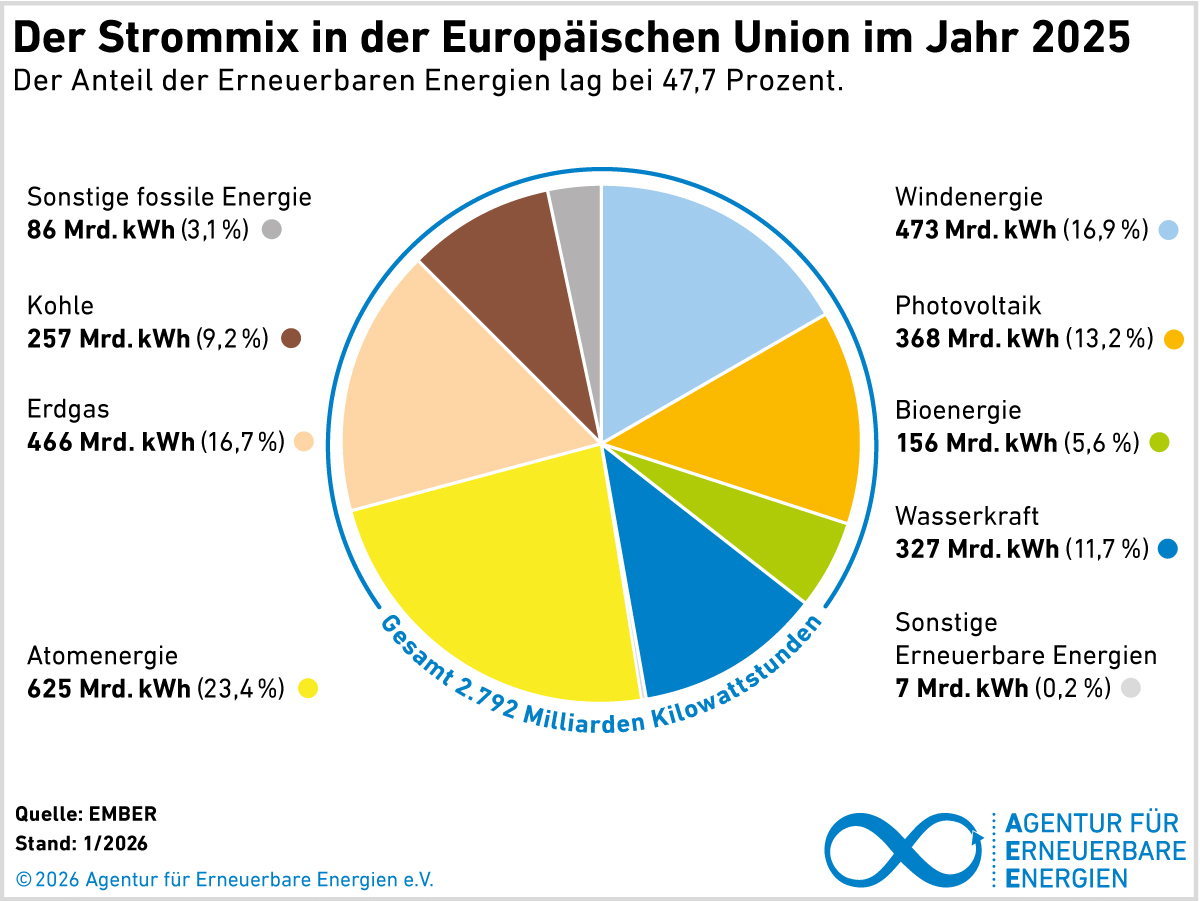 Im Jahr 2025 stammte fast die Hälfte der gesamten Stromerzeugung in der Europäischen Union aus Erneuerbaren Energien. Zum ersten Mal in der Geschichte lieferten Sonne und Wind mehr Strom als fossile Energieträger. Zwar sorgten ungünstige Windbedingungen für ein schlechtes Windenergiejahr, das konnte durch ein außergewöhnliches Wachstum der Solarenergie jedoch überkompensiert werden. Dank der Neuinstallation von Photovoltaikanlagen und einer hohen Solareinstrahlung wuchs die Solarstromerzeugung im Jahr 2025 um 20 Prozent im Vergleich zum Vorjahr. Innerhalb der fossilen Energien gab es eine Verschiebung von Kohle zu Gas.