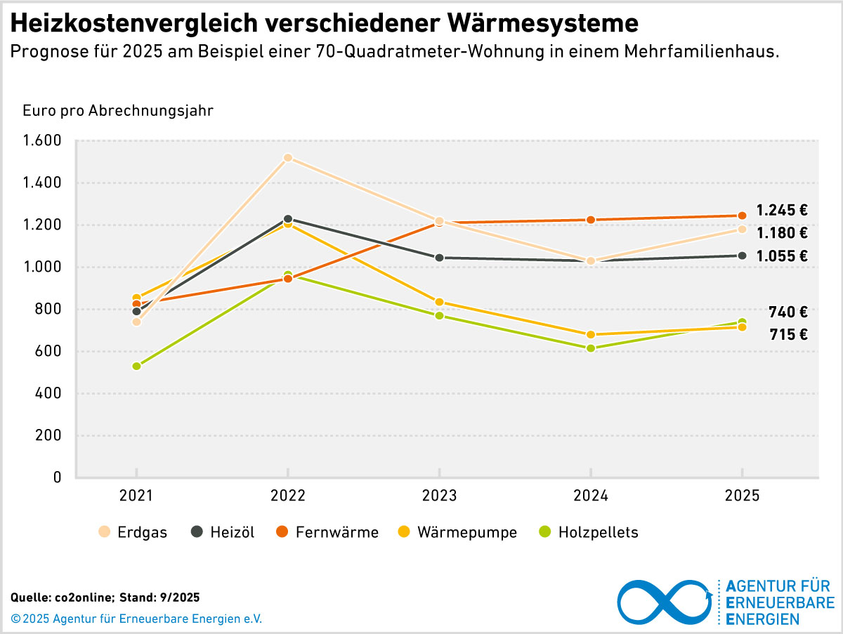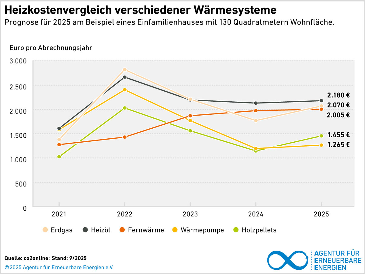 Im Hinblick auf die jährlichen Heizkosten sind Wärmepumpen und Holzpellets inzwischen die günstigste Lösung.