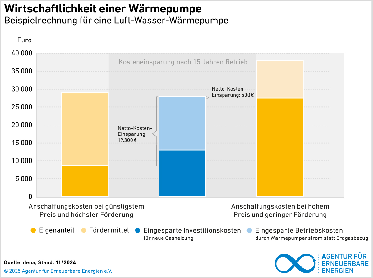 Investitionskosten zwischen 29.000 und 38.000 Euro und Fördermitteln zwischen 10.500 Euro (Grundförderung + Effizienzbonus) und 20.300 Euro (einkommensabhängige Maximalförderung bei 21.000 Euro) rechnet die Deutsche Energieagentur (dena) mit einer Netto-Kosteneinsparung von 500 bis 19.300 Euro nach 15 Jahren. Selbst unter ungünstigen Annahmen ist eine Wirtschaftlichkeit demnach gegeben. Im konkreten Einzelfall hängt die Wirtschaftlichkeit von verschiedenen Faktoren ab, darunter dem Heizenergiebedarf und damit dem Stromverbrauch der Wärmepumpe, der Entwicklung von Gas- und Strompreisen und eventuellen künftigen Änderungen der Förderbedingungen. Der Beispielrechnung sind die Ende 2024 geltenden Regelungen und Förderbedingungen des Gebäudeenergiegesetzes 2024 für Bestandswohngebäude zugrunde gelegt.