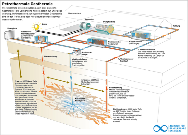 Dabei wird in künstlich vergrößerte Risse und Klüfte unter hohem Druck Wasser eingepresst. Das Wasser erhitzt sich im ca. 200°C heißen Gestein. Eine Förderbohrung pumpt das ca. 90 - 150°C heiße Wasser dann wieder an die Erdoberfläche. Dort kann es wie bei der hydrothermalen Geothermie über Wärmetauscher für die Wärmeversorgung genutzt werden. Sinnvoll ist die gleichzeitige Stromerzeugung mit einer zwischengeschalteten Turbine.