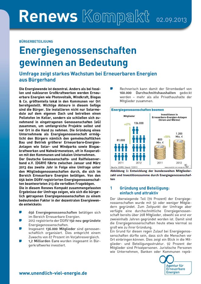 Der Deutsche Genossenschafts- und Raiffeisenverband e.V. (DGRV) führte zwischen Januar und März 2013 das zweite Jahr in Folge eine Umfrage unter den Mitgliedsgenossenschaften durch, die sich im Bereich Erneuerbare Energien betätigen. Von den 656 beim DGRV registrierten Energiegenossenschaften beantworteten 213 die verteilten Fragebögen.