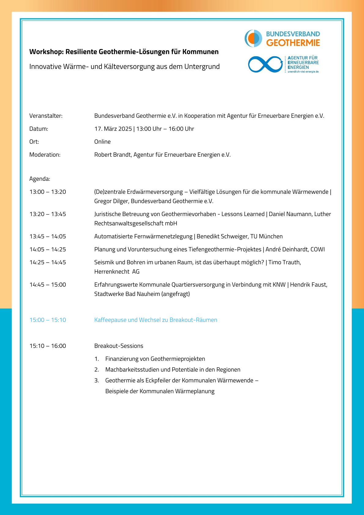 Im Workshop beleuchten Expert*innen technische, rechtliche, planerische und finanzielle Aspekte der geothermischen Energieversorgung und geben praxisnahe Einblicke in aktuelle Projekte und Erfahrungen aus der kommunalen Umsetzung.